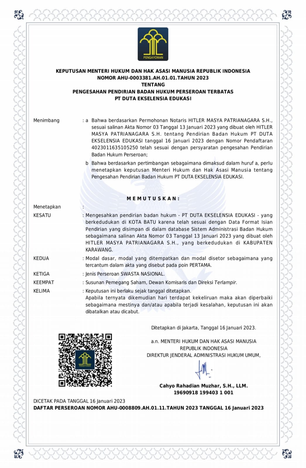 Kami telah terdaftar resmi di Kemenkumham Indonesia dengan nomer surat AHU-00003381.AH.01.01.TAHUN 2023 dengan nomer pedanfataran 4023011635105250.
